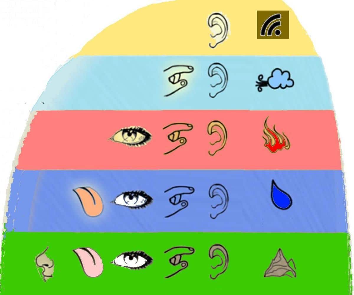 • 5) из Танматр Звук (Шабда), Касание (Спарша), Форма (Рупа), Вкус (Раса) и Запаха (Гандха) — Стихия «Земля» (Притхиви-Махабхута).