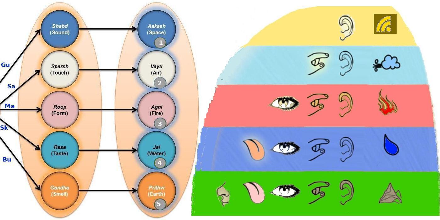 • 5) из Танматр Звук (Шабда), Касание (Спарша), Форма (Рупа), Вкус (Раса) и Запаха (Гандха) — Стихия «Земля» (Притхиви-Махабхута).
