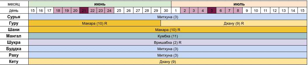 До конца июня наша Сила Мудрости также всё ещё не в наилучших своих качествах — Граха Гуру в Макара Раши. Не стоит рассчитывать на рассудительность и рациональность, нам всё так же будет некогда “поднять голову” от рутины, обязанностей. Впрочем, Сила Шани нам в помощь – терпения и выдержки будет предостаточно.
