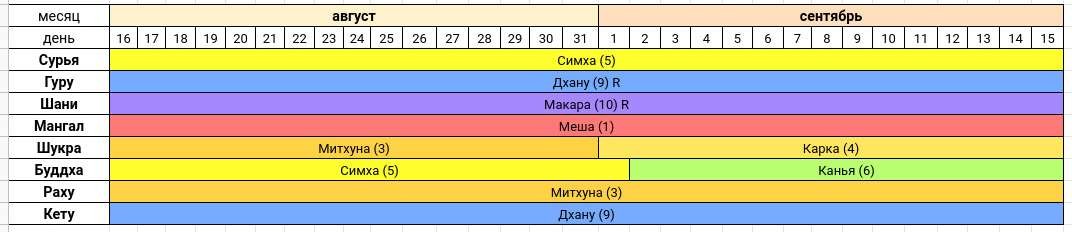 Телесность (Граха Шукра) в августе всё ещё напряжённая, вынужденная действовать, проявляться, выражаться. Но в сентябре она переходит в утончённое, “душевное” состояние. Можно насладиться внутренним комфортом, постарайтесь прочувствовать-ощутить родные места/вещи/явления и телом и душой.