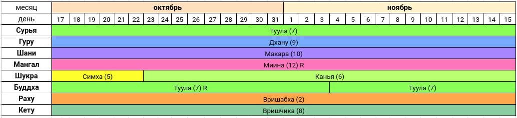 17 октября Сила Духа/Рода/Сознания [Граха Сурья] вошла в Раши — знак сидерического зодиака — Туула [Весы]. И это — наиболее слабое Его состояние. Мы видим, что природа неумолимо увядает, всё готовится к зимним холодам и у Солнца сейчас способность пробуждать природу наименее выражена.