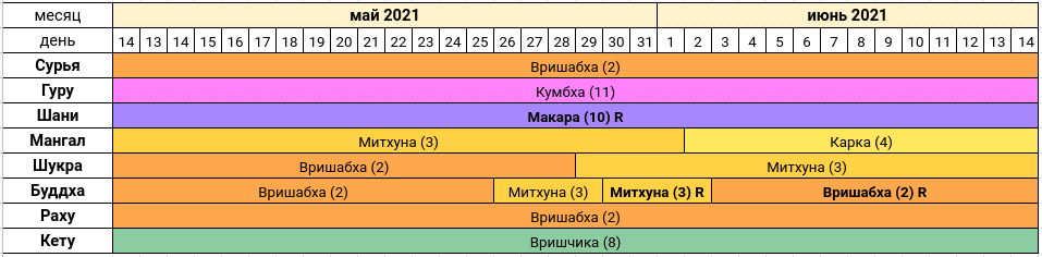 Далее Буддха переходит в 3-й знак Зодиака – Митхуна. Это уже место действия, проявления, влияния на окружение. Наконец мы станем более эффективными в коммуникациях. Нам захочется больше общаться, влиять на других посредством слов, писем, знаков, мы сможем “блеснуть интеллектом”, особенно 29-го мая. Используйте этот день для максимального проявления способности самовыражения. Однако, с 30 мая начинается время пресловутого ретроградного Меркурия :-), поэтому перепроверяем трижды всё, что связано с оформлением, знаками, подписями, коммуникациями, не очень надеемся на интеллект, цифры и в целом на свои способности к дискриминации и различению.