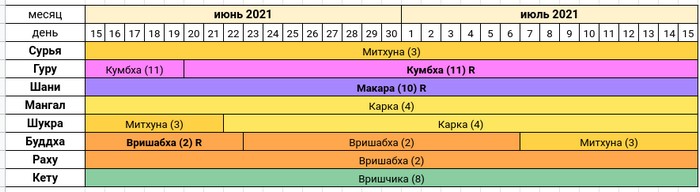 Отдельно стоит отметить, что Грахи Шани, Гуру и частично Буддха – ретроградны в этот солнечный месяц. Это указывает на повторение жизненных уроков в соответствии с качествами Грах. Мы испытаем некоторое ощущение дежавю.
