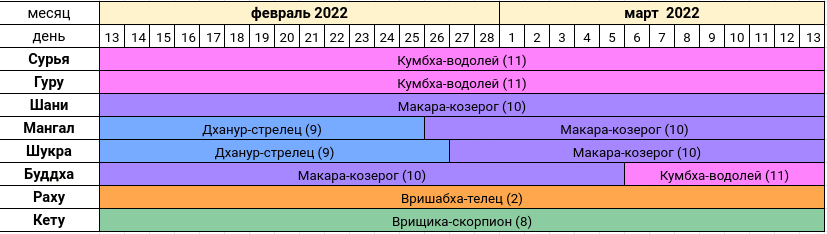 В середине февраля Граха Сурья — Сила Духа/Сознания [“планета Солнце”] — меняет своё положение в пространстве. Его новое место пребывания — Раши Кумбха (“знак Водолей”) — «воздушной» природы и неподвижный, принадлежит Грахе Шани (Сатурну).