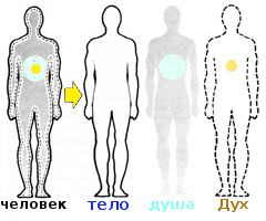 Материальная сторона человека – это его тело. Духовная основа человека – это его Дух (его сознание, его “искра божья”, его “Я”). Дух и тело – не просто разные, а противоположные по качествам и целям. Поэтому их связывает “душа” (восприятие, ощущения, чувства).